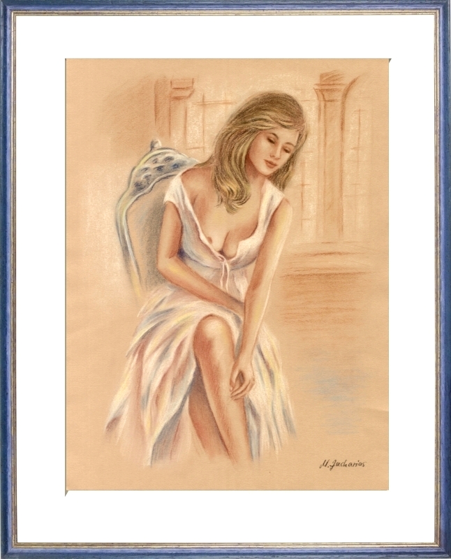 Sexy Woman in White Dress Pastel Painting, 40 x 50 cm with frame, Price on request